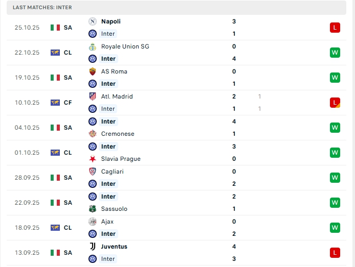 Inter Milan sau 8 trận đấu, đội bóng này mang về 19 bàn thắng cùng hàng thủ nhận 11 bàn thua, 4/5 trận vừa qua của Inter Milan khép lại từ 3 bàn trở lên, hàng công đang thi đấu ấn tượng, dù vậy hàng thủ không quá chắc chắn, trên sân nhà của mình ở 5 trận gần nhất thì cả 5 trận của Inter Milan đều vượt mốc 3 bàn.