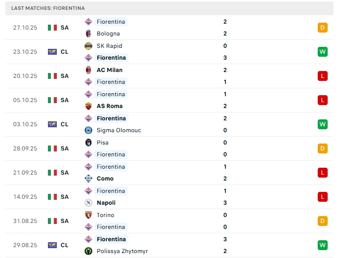 Fiorentina sau 8 trận đấu này, đội bóng này mang về7 bàn thắng cùng hàng thủ nhận 12 bàn thua, 4/5 trận vừa qua của Fiorentina khép lại từ 3 bàn trở lên, hàng thủ của các vị khách đang chơi thiếu chắc chắn, đặc biệt mỗi khi hành quân xa nhà, ở 2/3 trận xa nhà gần nhất đều kết thúc trên 3 bàn.