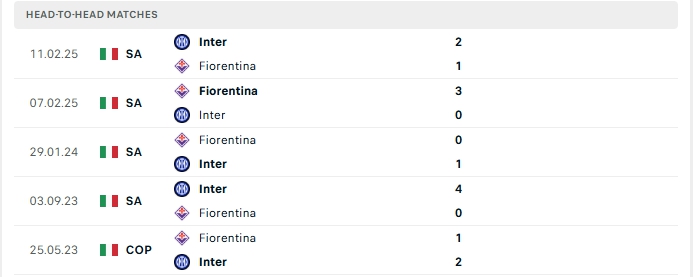 Quá khứ đối đầu Inter Milan vs Fiorentina